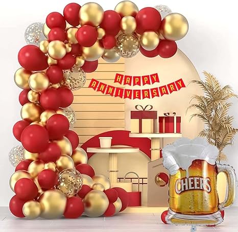 Happy Anniversary Red Banner 1 PCS + 40 PCS Balloons ( 20 PCS Red Balloons + 20 PCS Gold Balloons) + 5 PCS Confetti Balloons + 1 PCS Cheers Foil Balloon