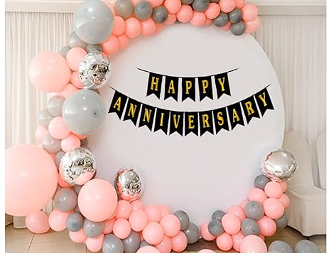 Happy Anniversary Black Banner 1Pcs + 50PCS Pastel Balloons ( 25PCS Peach Balloons + 25PCS Grey Balloons) + 5PCS Silver Chrome Balloons