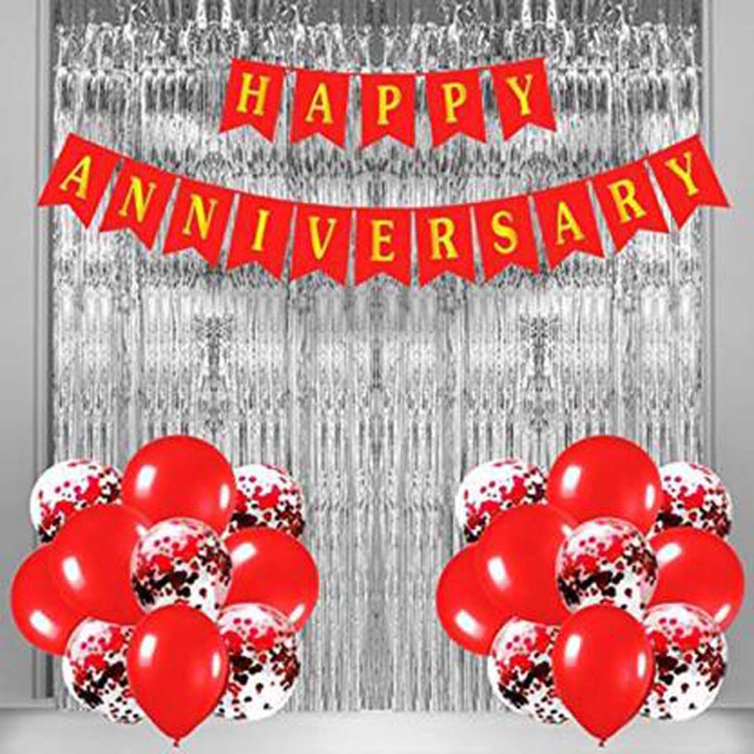Happy Anniversary Combo Includes: 1 PCS Happy Anniversary Black Banner + 20 PCS HD Metallic Balloon ( 10 PCS Red & 10 PCS Silver ) + 3 PCS Silver Star Mylar Balloon ( 5 Inch ) + 1 PCS Silver Moon Mylar Balloon + 1PCS Red Fringe Curtain .