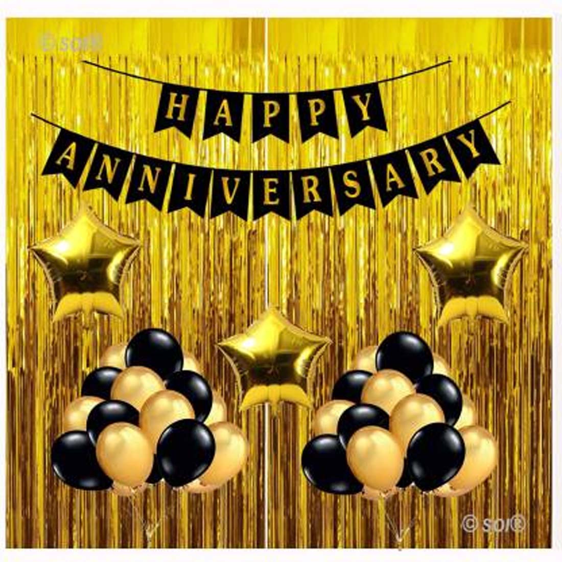 DIY includes: 1 Happy Anniversary Banner Set with Ribbon + 30 Metallic Balloons ( 15Black/15Gold) + 3 Star Gold Foil + Curtain. ( Total Pack of 36)