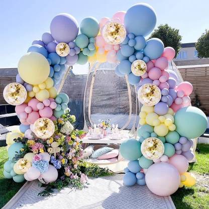 Balloons Garland DIY Kit Incudes’: 5 Pcs 18" Big Size Pastel Balloons (Blue Purple Pink Yellow Green - 1 Pc each color), 100 Pcs 12” Pastel Balloons (Blue Purple Pink Yellow Green- 20 Pcs each color), 5 Pcs Transparent balloons with prefilled confetti, 3 Pcs 18” Round Foil Gold Balloons, 1Pc 5 Meter balloon arc and 1pc 100dot glue dot. Assembly time: Approx. 20 minutes