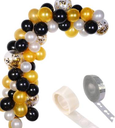Balloons Garland DIY Kit Incudes : 50 Pcs HD Metallic Balloons (Black & Gold & Silver) + 5 Pre Filled Confetti HD Balloon 1 Pc Glue dot roll (100 dots) + 1 Pc Balloon Garland Arch (5 Meter). Note : Please blow balloons accordingly to make size small and big. Assembly time : Approx 20 minutes.