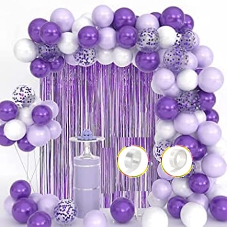 Balloons Garland Kit includes : 50PCS Balloons ( 17PCS Purple Balloons + 16PCS White Balloons + 17PCS Pastel Purple ) + 5PCS Pink Confetti Balloons + 1PCS Pink Curtain + 1PCS Arch + 1PCS Glue Dot .