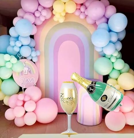 60PCS Pastel Balloons Garland ( 10PCS Pastel Yellow Balloons + 10PCS Pastel Green Balloons + 10PCS Pastel Blue Balloons + 10PCS Pastel Purple Balloons + 10PCS Pastel Pink Balloons + 10PCS Pastel White Balloons ) + 5PCS Big Pastel Balloons ( Yellow /Green /Blue /Purple /Pink ) + 5PCS Gold Chrome Balloons + 1PCS Champagne Balloon + 1PCS Cheers Balloon + 1PCS Arch + 1PCS Glue Dot .