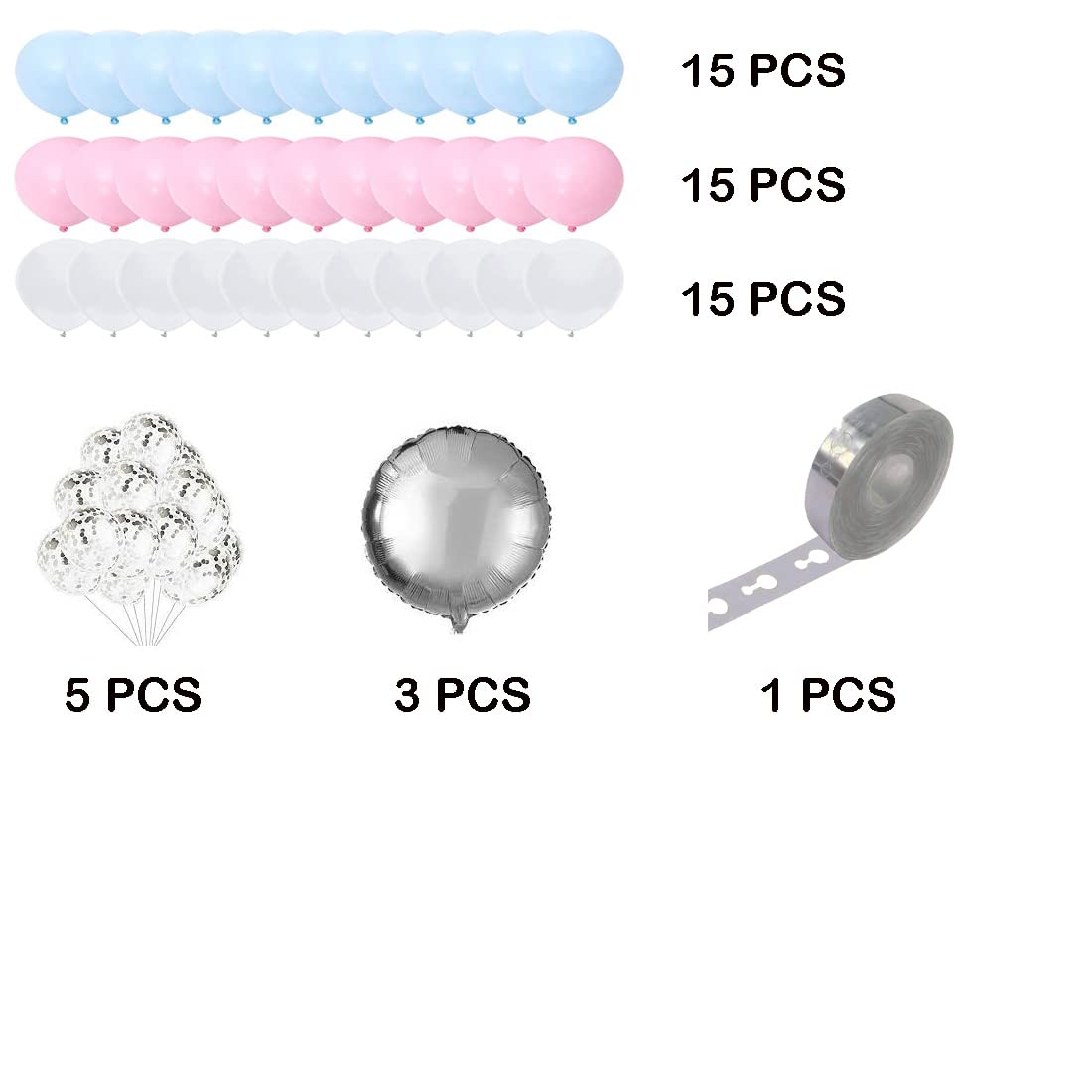 Balloons Garland : 15 PCS Pastel Pink Balloons +15 PCS Pastel White Balloons +15 PCS Pastel Blue Balloons + 5 PCS Confetti Balloons + 3 PCS Silver Foil Round + 1 PCS Arch