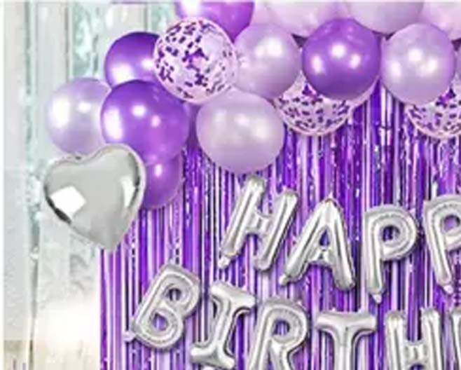 DIY Happy Birthday Purple Theme Kit includes: Happy Birthday Letters Foil Balloons (13-Letters) + 24 Pcs HD Latex Balloons (12 Metallic Purple + 12 Pastel Purple Balloons) + 5 Pcs Prefilled Confetti Balloons + 2 Pc Silver Heart Foil Balloons + 2 Pcs Purple Star Foil Balloons + 1 Pc Big size Purple Curtain . Ribbon included and Straw included. Assembly time approx. 20 Minutes.